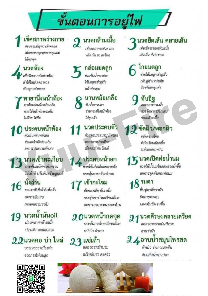 👩 คุณแม่หลังคลอดบุตรแล้วจะมีการเสียสมดุลของธาตุในร่างกาย การอยู่ไฟคือการใช้ความร้อนในการรักษาและฟื้นฟูมารดาหลังคลอด ด้วยกรรมวิธีของศาสตร์การแพทย์แผนไทย มากที่สุดถึง 24 ขั้นตอน สลับกันในแต่ละวัน ละเอียดและใส่ใจมากที่สุด ใช้เวลาในการทำ แต่ละวัน 4 ชั่วโมง .